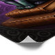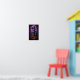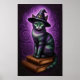 Dieses skurrile Poster besticht durch eine Hexenkatze, die auf zwei stapelbaren Büchern in einem lebendigen lila Hintergrund sitzt.