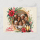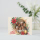 A joyful Christmas postcard featuring a customizable photo framed by poinsettias, pine, candy canes, and golden ornaments. A glowing lantern adds warmth against a soft beige backdrop with stars and snowflakes. All text—front and back—is fully customizable to share your holiday cheer.