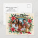 A joyful Christmas postcard featuring a customizable oval photo of loved ones framed by poinsettias, holly, candy canes, and a glowing lantern. Set against a warm beige backdrop with red bows and stars, this design radiates festive charm. All text—front and back—is fully customizable for sharing heartfelt holiday cheer.