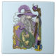Ein Zauberer, lila, der eine lila Kristallkugel hält. Ein kleiner grüner Drache, keltische Knoten, Kerze und ein Rand des Herbstes hinterlassen alles in einem hellblauen Hintergrund