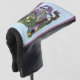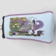 Ein Zauberer, lila, der eine lila Kristallkugel hält. Ein kleiner grüner Drache, keltische Knoten, Kerze und ein Rand des Herbstes hinterlassen alles in einem hellblauen Hintergrund