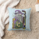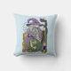 Ein Zauberer, lila, der eine lila Kristallkugel hält. Ein kleiner grüner Drache, keltische Knoten, Kerze und ein Rand des Herbstes hinterlassen alles in einem hellblauen Hintergrund
