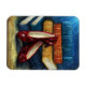This artwork is inspired by the beloved children's classic: The Wonderful Wizard of Oz books. Even though Dorothy's magic slippers are silver in the book, they were designed to be red in the Technicolor movie to show up more vividly against the yellow brick road and are one of the most iconic items.