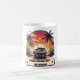 Ein ruhiger Sonnenuntergang mit einem Retro-Van, geparkt von einem tropischen Strand, umgeben von üppigen Palmen und lebhaften Farben. Die beruhigenden Wellen und die warmen Farben des Himmels schaffen eine perfekte Mischung aus Abenteuer und Ruhe. Dieses Kunstwerk verkörpert den Geist der Erkundung und die Schönheit der Träume, wo der Horizont zu einem Tor zu endlosen Möglichkeiten wird