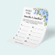 Blaue Blumen Wo waren sie? Englisch und Spanisch Spiele in der Version inbegriffen (vorne und hinten). Ändern Sie den Wortlaut in das Design für die englische und spanische Version. Für zusätzliche Anpassungen (Umformung, Hinzufügen oder Löschen der Anzahl der Fotos, Schriftart, Schriftart Stil ), klicken Sie auf Personalisieren, scrollen Sie nach unten und klicken Sie auf den Link "Klicken Sie, um weiter anzupassen". WIE MAN SPIELT: Zeigt Fotos der Braut und des Bräutigams an verschiedenen Orten an und nummeriert sie. Die Gäste schreiben ihre Schätzung für jedes Foto und die Person mit den besten Antworten gewinnt!