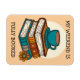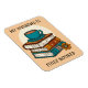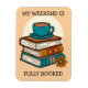 Whimsical Magnetdesign für Buchliebhaber und Buchwürmer. Eine Illustration eines gemütlichen Bücherhaufen mit einer Kaffeetasse, die oben ausgeglichen ist. Die Farben sind Blues, Rot und Orangen. Oben und unterhalb des Bildes befinden sich die Worte "Mein Wochenende ist voll gebucht" in schwarzem Text. Dies sind Vorlagen, mit denen Sie Ihre eigenen Wörter hinzufügen können, wenn Sie sie ändern möchten.