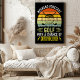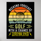 Diese spielerische Abbildung zeigt einen im Retro-Stil gestreiften Sonnenuntergang in warmen Farbtönen Orange, Gelb und Grün, Set hinter einem großen, strukturierten Golfball mit zwei gekreuzten Golfschlägern. Unter dem Golfball ist grünes Gras dargestellt. Der obere Text "WEEKEND FORECAST" kurbelt über dem Sonnenuntergang, während "GOLF" in der Mitte deutlich sichtbar angezeigt wird, darunter "MIT EINER CHANCE OF". Der untere Text "DRINKING" ist in einem lebhaften Gelb, flankiert von kleinen Bierflaschen-Ikonen, die die humorvolle Prognose für ein entspanntes Wochenende vervollständigen.