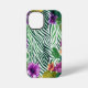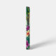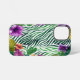 Das Bild zeigt ein lebendiges Mosaik aus üppigen Monstera-Blättern in sattem Grün und Gelb, kombiniert mit prächtigen purpur- und orangefarbenen Blumen, die sich vor einem dynamischen, wellenartigen Hintergrund abheben. Es strahlt eine wilde, tropische Energie und eine fröhliche Fülle aus, die Neugier und Naturverbundenheit weckt.
