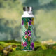 Das Bild zeigt ein lebendiges Mosaik aus üppigen Monstera-Blättern in sattem Grün und Gelb, kombiniert mit prächtigen purpur- und orangefarbenen Blumen, die sich vor einem dynamischen, wellenartigen Hintergrund abheben. Es strahlt eine wilde, tropische Energie und eine fröhliche Fülle aus, die Neugier und Naturverbundenheit weckt.