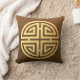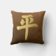 Die Vorderseite des Kissens hat das asiatische Symbol für Reichtum, Wohlstand und Glück mit dem goldenen Aussehen aus braunem Wildleder. Der Rücken hat die Kalligraphie für Frieden im gleichen goldgeprägten Look.