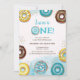 Wohnung 1. Geburtstagskarte, geschmückt mit einem Bild von süßen, jugendlichen Donuts.