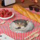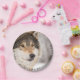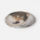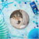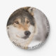 Tiere, Wildtiere, Wildtiere, Lumberjack zum Thema Geburtstag. Foto eines Wolfskopfes. Ein freundlich aussehender Wolf mit einem Lächeln auf dem Gesicht. Es ist Winter mit weißem, schneebedecktem Hintergrund. Ein Teller für die 13. Geburtstagsfeier eines Teenagers. Mit dem Text: Happy Birthday (x2) Vorlage für den Namen des Kindes, schwarze Buchstaben. Geschwungener Text.