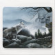 Zwei Wölfe sitzen zwischen Felsen außerhalb eines Schlosses. Berge um sie herum.
