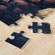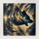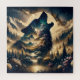 Bild in einem Bild. Ein Wolf heult auf dem Mond mit Bergen und Waldhintergrund.