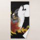 Ein Wolf heult auf Vollmond mit Herbstblättern und Eicheln in schwarzer Umgebung