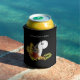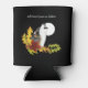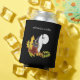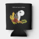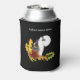 Ein Wolf heult auf Vollmond mit Herbstblättern und Eicheln in schwarzem Hintergrund.