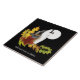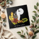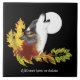 Ein Wolf heult auf Vollmond mit Herbstblättern und Eicheln vor einem Hintergrund aus schwarz.