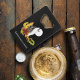 Wolf heult auf Vollmond mit Herbstblättern und Eicheln vor schwarzem Hintergrund