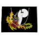 Ein Wolf heult auf Vollmond mit Herbstblättern und Eicheln in schwarzer Umgebung.
