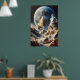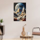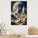 Ein Wolf heult auf dem Mond in einer fantastischen Landschaft schneebedeckter Berge und leuchtender Orben. Der große, blaue Mond füllt den Himmel und wirft ein ätherisches Licht über die Szene.