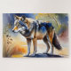 Hübscher schöner grauer Wolf stehend in einer Lichtung in einem waldfarbenen Gemälde. Ein perfektes Geschenk für Natur- und Kunstliebhaber und Liebhaber.