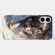 A majestic grey wolf with piercing yellow eyes stands on a thick tree trunk, its powerful paws gripping the bark. The wolf's fur is thick and textured, with a hint of brown around its muzzle. The background features a winter forest. Perfect gift for wolf lovers.