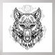 Wolf frontansicht mit ethnischen Dekorationen und spirituellen Symbolen des Mondes und der Pfeile. Predator Front-View-Portrait mit Curls und Stammesschmuck.