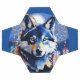 Schöner Wolf mit tiefen gelben Augen, mit Ureinwohner Amerikas Träumer, in einer wilden blauen Berglandschaft und Vollmond. Original Vector Round Logo Design abgeschieden auf weißem Copyright BluedarkArt The ChameleonArt.