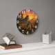 Wilderness wall clock depicts a watchful adult wolf standing on rocks with three curious pups, bathed in golden sunset light over mountain forests. White numerals on warm-toned backdrop create serene wild beauty—perfect for nature lovers or family-themed gifts.