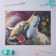 Auf dem Tissue-Blatt stehen Ölgemälde eines Wolfs im Profil, umgeben von Blume, in einer Gegenüberstellung von Schärfe und zarter Schönheit. Der Hund ist in diesem strukturierten Porträt mit einer femininen Touch noch immer eine beeindruckende Figur.