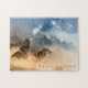 Dieses Spielpuzzlespiel wird mit einem Fotodruck der wilden Wölfe in einer mystischen Einstellung zusammen mit Text von Yellowstone gezeigt.