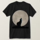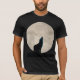 Eine schwarze Silhouette eines Wolfs mit Kopf erhob sich in der Luft und heulte auf einem sehr großen Vollmond.