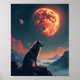 Wolf unter dem Blütenmond- Wolf unter dem Blütenmond- Ein einsamer Wolf sitzt an einem zerklüfteten Abgrund mit Blick auf eine endlose Weite von Wolken und Bergen. Der Himmel ist tiefblau, mit Sternen übersät, und ein großer, feuriger roter Mond dominiert die obere rechte Ecke des Bildes. Der Mond scheint zu brennen, mit leuchtenden orangen und gelben Adern, die über die Oberfläche laufen. Der Wolf ist gegen den hellen Mond silhouettiert, sein Fell ist dunkelgrau vor dem feurigen Hintergrund.