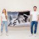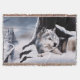 Ein Wolf im Schnee des Winters mit einer Burg hinter dem Wolf.