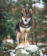 Wolfdog Hoodie. Schönes Foto des Wolfdog Nox, stehend auf einem Felsen, Bois de Vincennes, Paris, Frankreich. Foto von Tahoe Beetschen.
