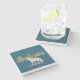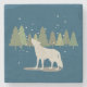 Ein Minimalistisches Design eines weißen heulenden Wolfs mit Schnee und Kiefernwald Hintergrund.