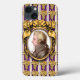 Dieses Design ist ein Portrait des klassischen Musikkomponisten Wolfgang Amadeus Mozart. Das Porträt ist ein Profilbild-Set in einem verzierten ovalen goldenen Rahmen. Der Rahmen hängt auf einem lila Tapeten-Hintergrund mit goldenen Traubenstäben in Reihen, und senkrechten weißen und Lavendel Streifen.