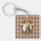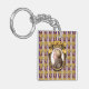 Das Originalwerk von ZoeSPEAK auf diesem Schlüsselanhänger zeigt ein Portrait des klassischen Komponisten Wolfgang Amadeus Mozart. Das Portrait ist ein Profil Set in einem verzierten ovalen goldenen Rahmen. Der Rahmen hängt auf einem lila Hintergrund mit goldenen Traubenbäumen in Reihen und senkrechten Streifen in Weiß und Lavendel.
