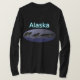 Eine kalte, grausame, mondbeleuchtete Winternacht. Ein hungriger Wolfspacker jagt um lebendig bleibe. Text mit "Alaska" in leuchtendem Blau und Weiß erscheint ebenfalls.