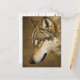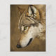 Nah-up-Portrait des Wolfs mit gelben Augen, rechts starrend. Braunes und graues Fell vor weichem braunem Hintergrund.