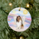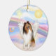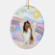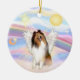 Ein eingängiger und weißer Collie-Engel schwimmt in den flauschigen Wolken des Himmels und strahlt Sonne, Stern und Mond in der Ferne aus