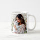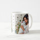 A pretty personalized coffee mug with an illustration of a woman holding a white fluffy cat surrounded by dandelions, The picture has a crochet style fabric look.