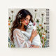 A pretty notebook that is personalized with an illustration of a woman holding a white fluffy cat surrounded by dandelions, The picture has a crochet style fabric look.