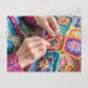 A woman holding a handmade crocheted coin purse crafted from colorful granny squares featuring a detailed floral motif. The image highlights traditional yarn craftsmanship, fine stitching, and the charm of creative handmade accessories.