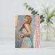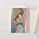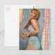 A beautiful woman from a a magazine photo from 1957 poses in her swimsuit on the beach in a collage on a vintage textbook page with random colorful lines on it