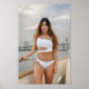 A swimsuit model in a stylish white swimsuit stands confidently on a yacht. The backdrop features a city skyline with a prominent bridge crossing over water.