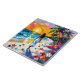 Add a touch of tropical beach to your home with this gorgeous colorful tile. A beautiful ai illustration done in an oil painting impasto style. A woman walking on the beach among palm trees, tropical flowers, turquoise waves, sea glass and seashells.