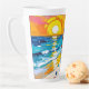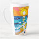Add a touch of tropical beach to your beverage container collection with this gorgeous colorful coffee mug. A beautiful ai illustration done in an oil painting impasto style. A woman walking on the beach among palm trees, tropical flowers, turquoise waves, sea glass and seashells.