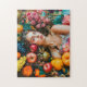 A woman holds grapes surrounded by a floral arrangement. The portrait blends richness, elegance, and natural textures in a vivid, expressive style.