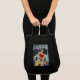 Wonder Woman stehend groß mit ihren Fäusten an ihrer Seite. Im Hintergrund sehen Sie die hohen Gebäude und Wolkenkratzer der Stadt, vor einem Retro-Sonnenaufgang und Wonder Woman's Namen im Himmel.